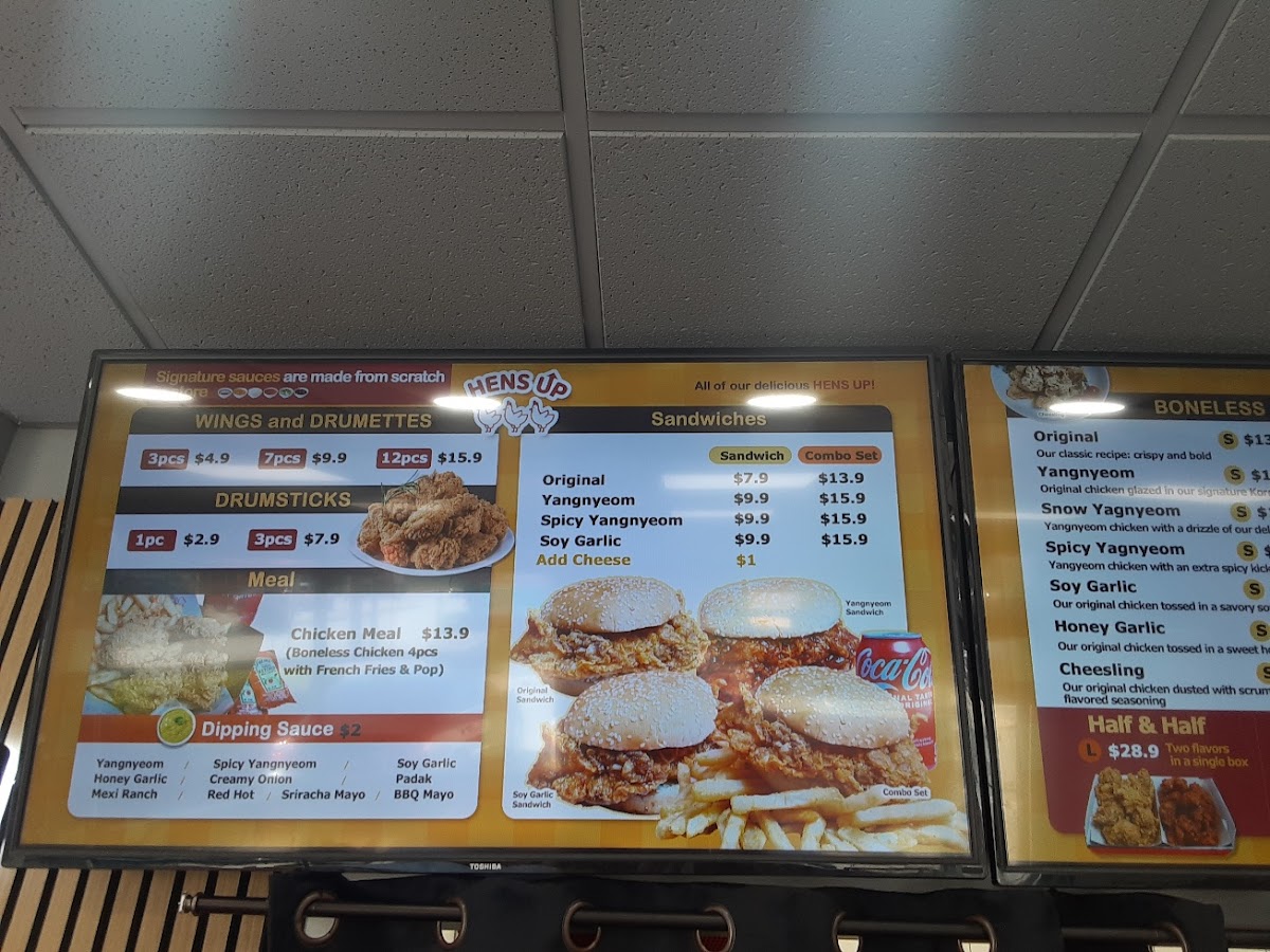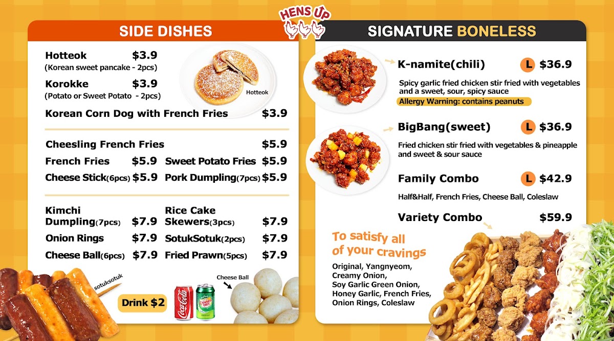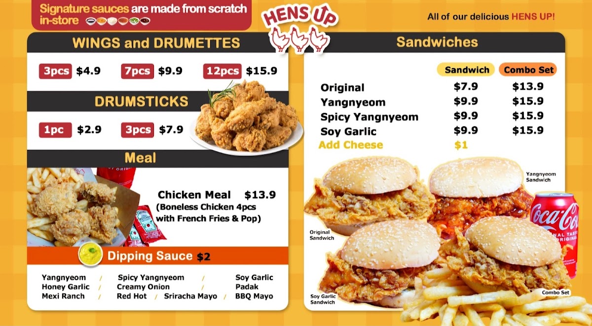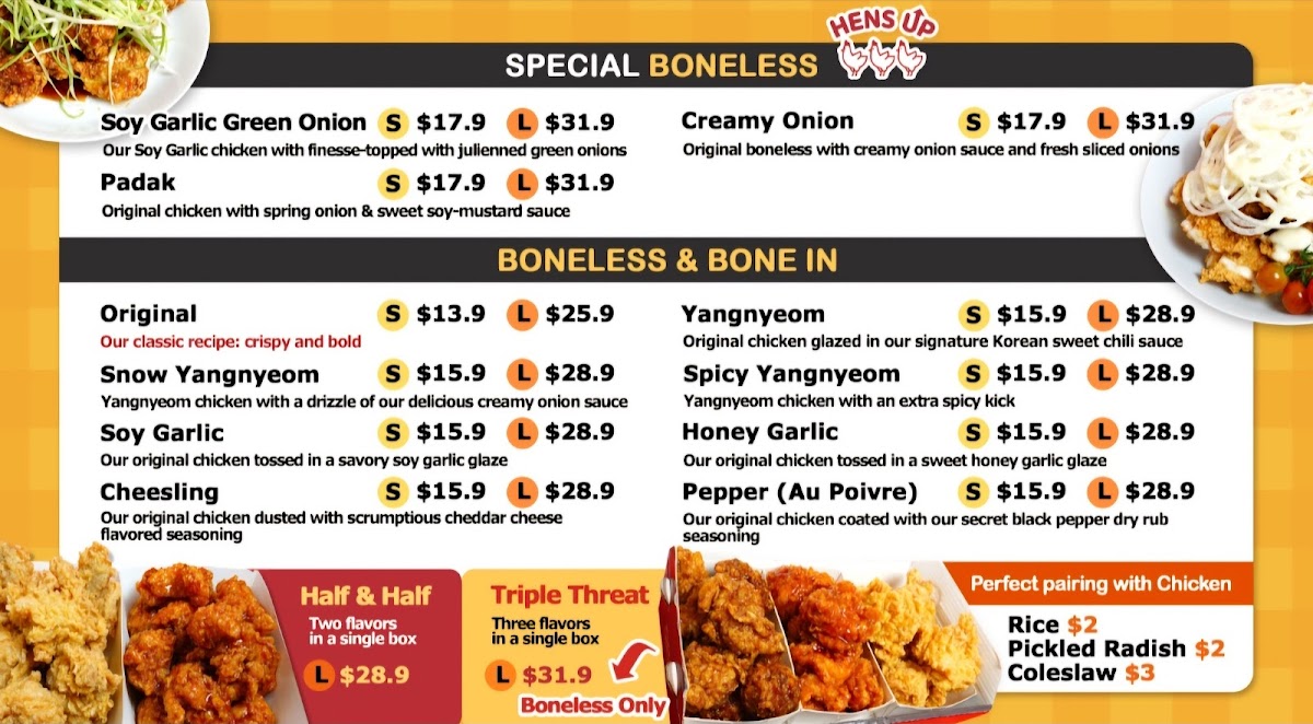 Hens Up Chicken offers a diverse and flavorful menu that will appeal to anyone craving delicious fried chicken with a twist. A standout is the Half&Half, a combination of two distinct flavors in one meal, providing the best of both worlds. For those who enjoy a bit of heat, the Thriple Threat brings the spice, while the K-namite (Chili) offers a fiery kick with a unique chili flavor. On the sweeter side, the BigBang (sweet) delivers a satisfying balance of sweet and savory. The Variety Combo is perfect for those who want a bit of everything, offering a variety of chicken flavors to satisfy every craving. Whether you prefer spicy, sweet, or a little bit of both, Hens Up Chicken has something for everyone to enjoy.
