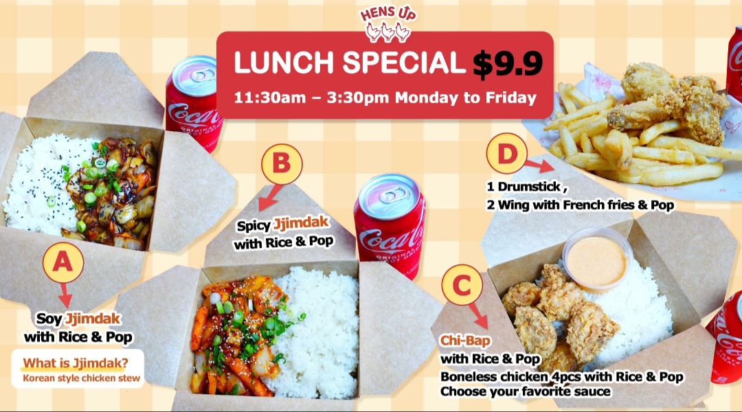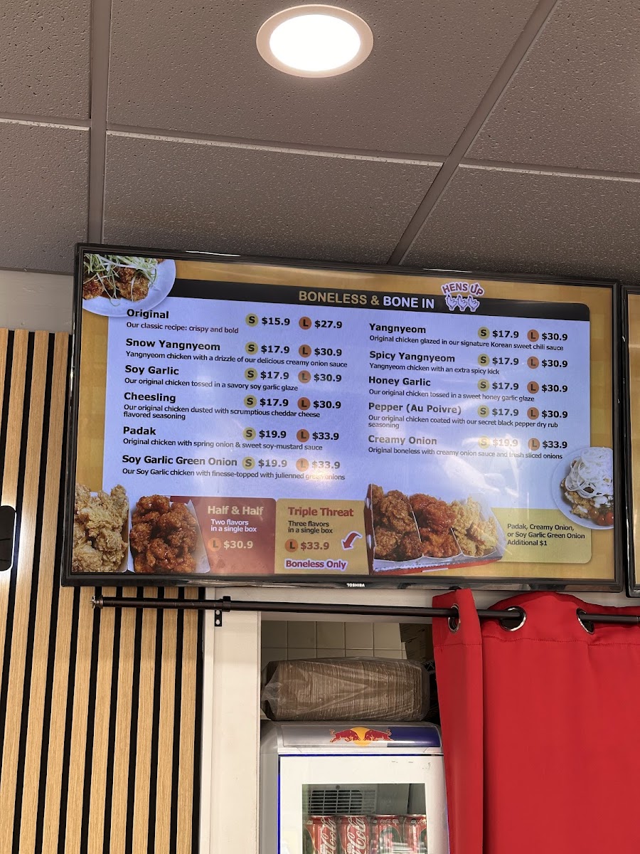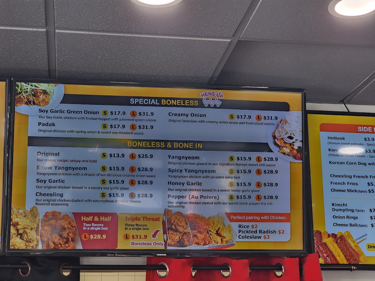 Hens Up Chicken offers a diverse and flavorful menu that will appeal to anyone craving delicious fried chicken with a twist. A standout is the Half&Half, a combination of two distinct flavors in one meal, providing the best of both worlds. For those who enjoy a bit of heat, the Thriple Threat brings the spice, while the K-namite (Chili) offers a fiery kick with a unique chili flavor. On the sweeter side, the BigBang (sweet) delivers a satisfying balance of sweet and savory. The Variety Combo is perfect for those who want a bit of everything, offering a variety of chicken flavors to satisfy every craving. Whether you prefer spicy, sweet, or a little bit of both, Hens Up Chicken has something for everyone to enjoy.